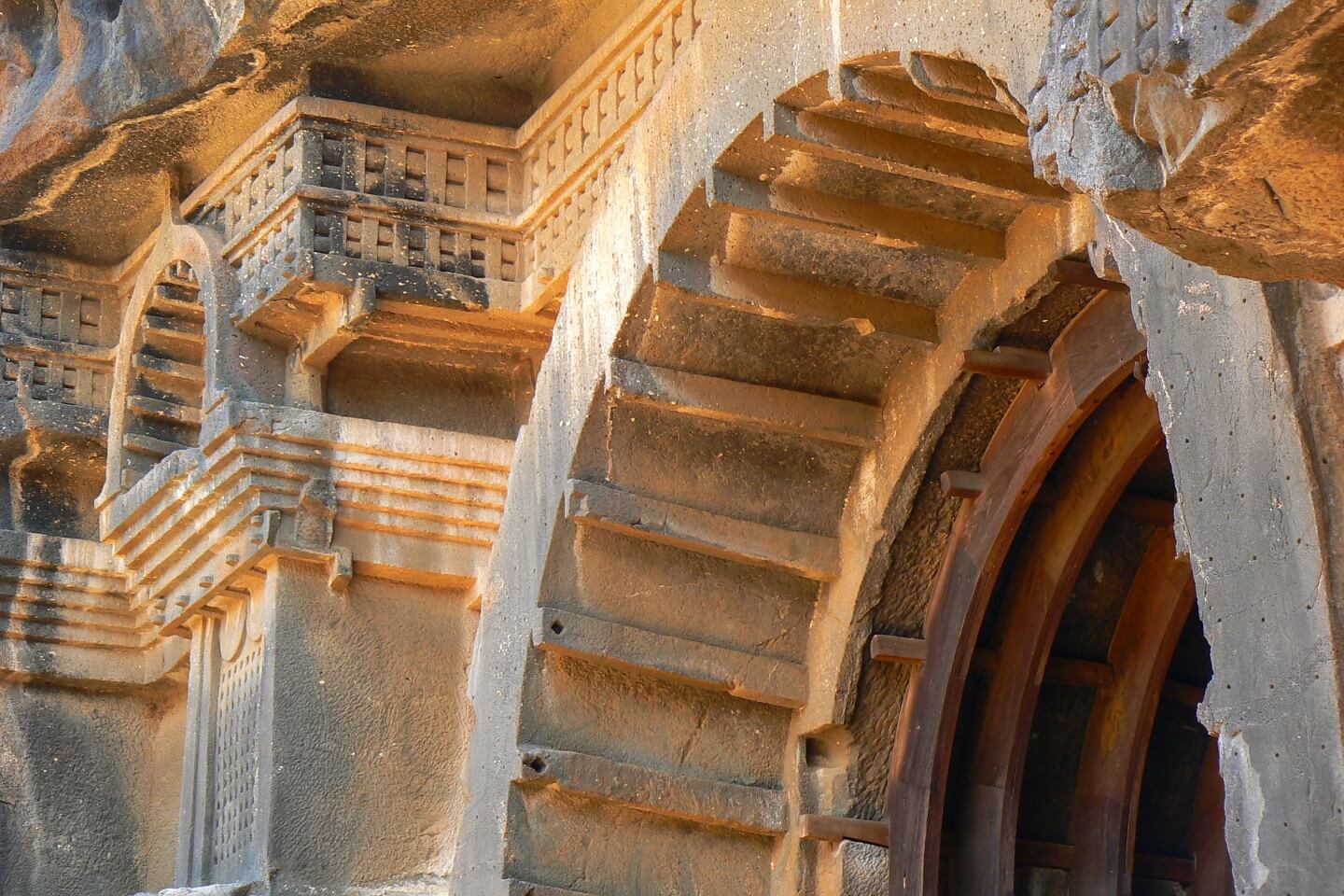 2. Marvelling at the majestic architecture – The cave complex has been standing here for over 2000 years. It boasts an intricate rock-cut architecture forming several prayer halls and residential caves. The main prayer hall (Cave 12) is the highlight of Bhaja Caves. It’s several metres high, with an arched gateway. Other prominent features of the cave are horseshoe-shaped ceiling, mythological wall carvings and wooden architecture.